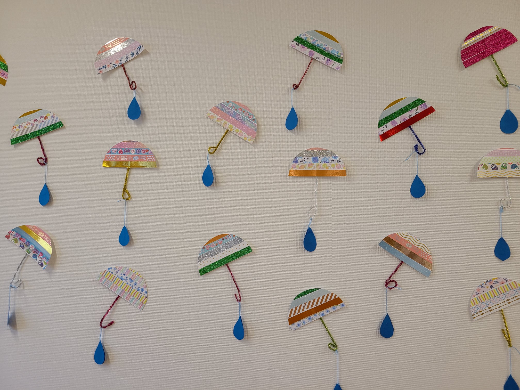 かたつむりをよ~くご覧ください。とても愛くるしい瞳の子がいますね。○シールに目を描いてもらったのですが、スタッフの「目を描いて下さいね」の指示を忠実に守り、シールに「め」と書いて下さった方が・・・(笑)でも、なぜかとても愛くるしくて、しっくりなじんでいます。言葉で伝えるのって難しいですね。創作をしていると、思いがけず色々な作品が生み出されるので、そんなハプニングも楽しみつつプログラムを行っています。